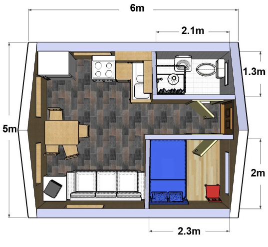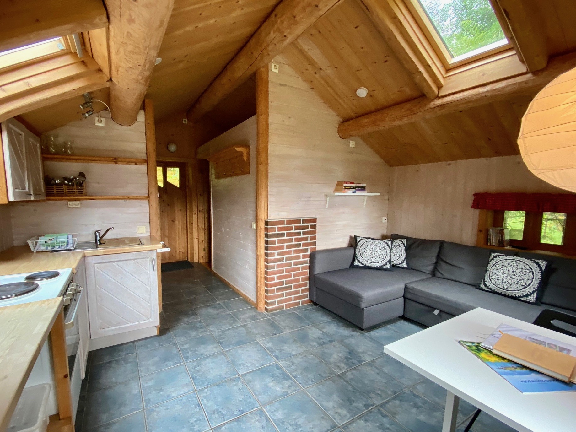 STEIN HÜTTE: 2 – 4 Personen 1 Schlafzimmer mit Doppelbett, 1 Schlafsofa für 2 Personen, Badezimmer mit Du/WC, Wohnküche. Die Küche ist komplett ausgestattet. Die Hütte hat Fußbodenheizung. Bettwäsche und tücher kann gemietet werden.